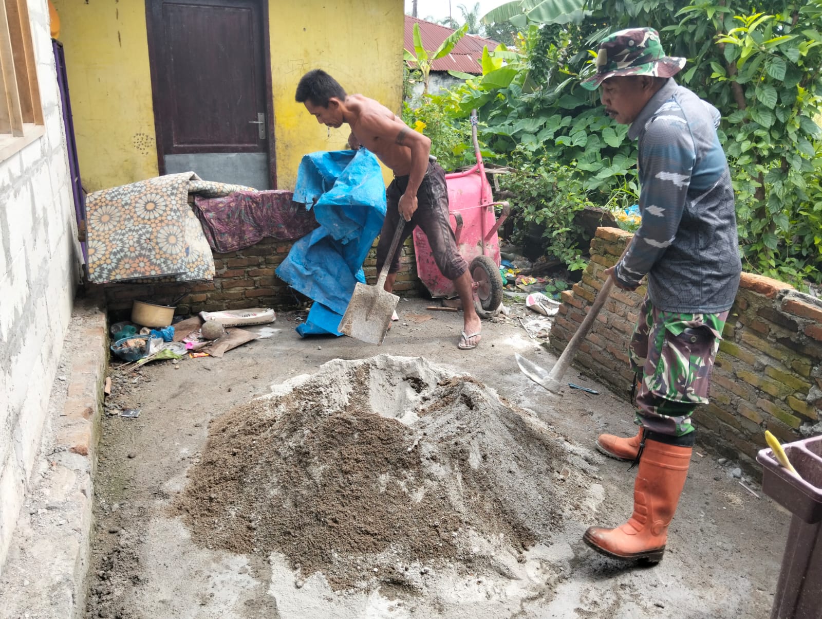 Masih terlihat dihalaman rumah Pak Syafaruddin adanya kegiatan pembangunan, di mana dua pria sedang mencampur adukan material (pasir, semen, dll.)