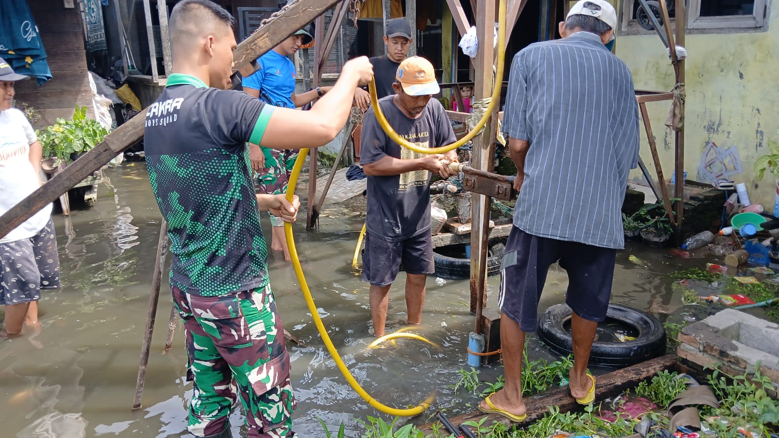 Aktivitas gotong royong pemasangan atau pengeboran sumur air bersih di lokasi yang tergenang air, tidak menyurutkan semangat personal TNI, Polri juga masyarakat sekitarnya.