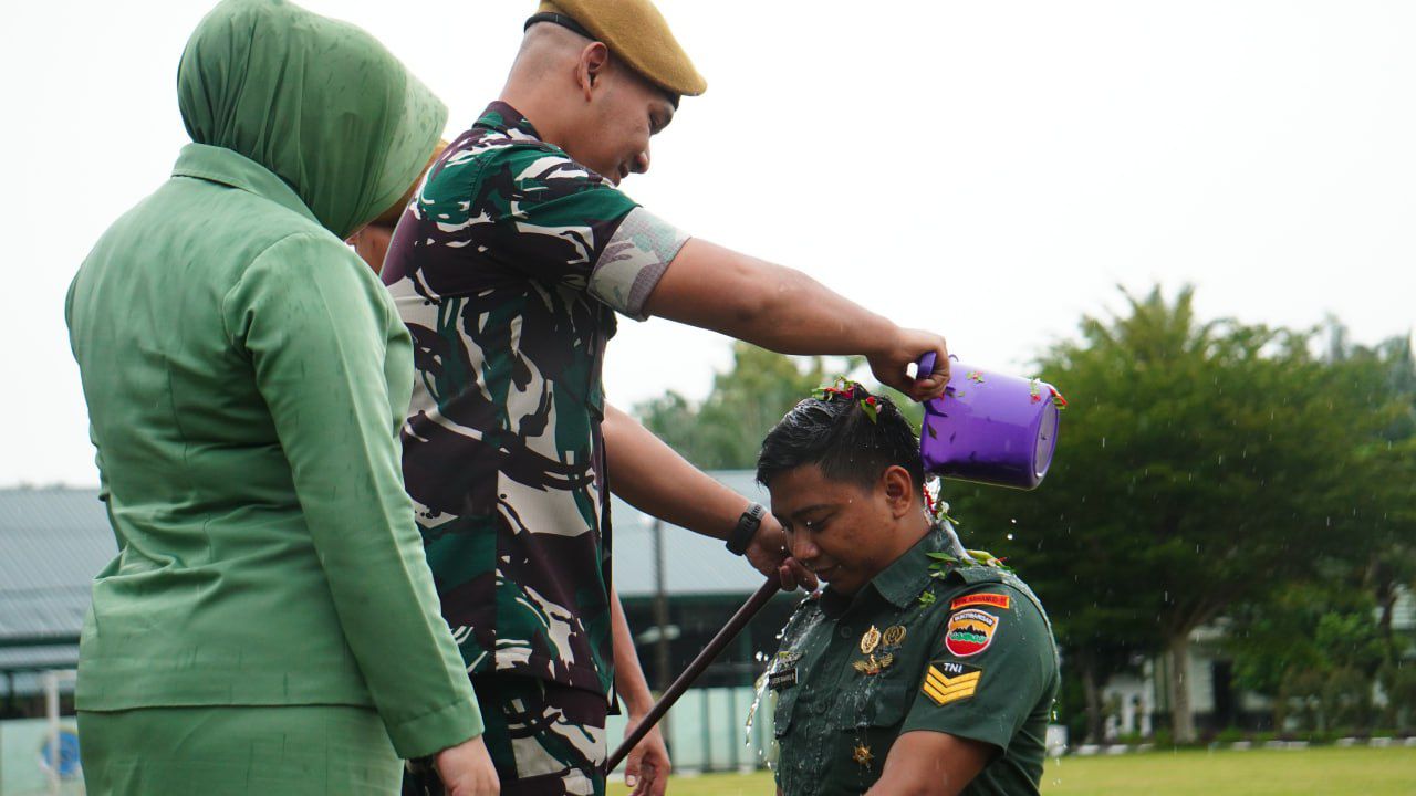 Upacara kenaikan pangkat yang dihadiri seluruh personel dan ibu Persit tersebut juga digelar Tradisi Penyiraman Bunga dan acara syukuran kenaikan pangkat di gladi beratap kepada 32 prajurit naik pangkat.