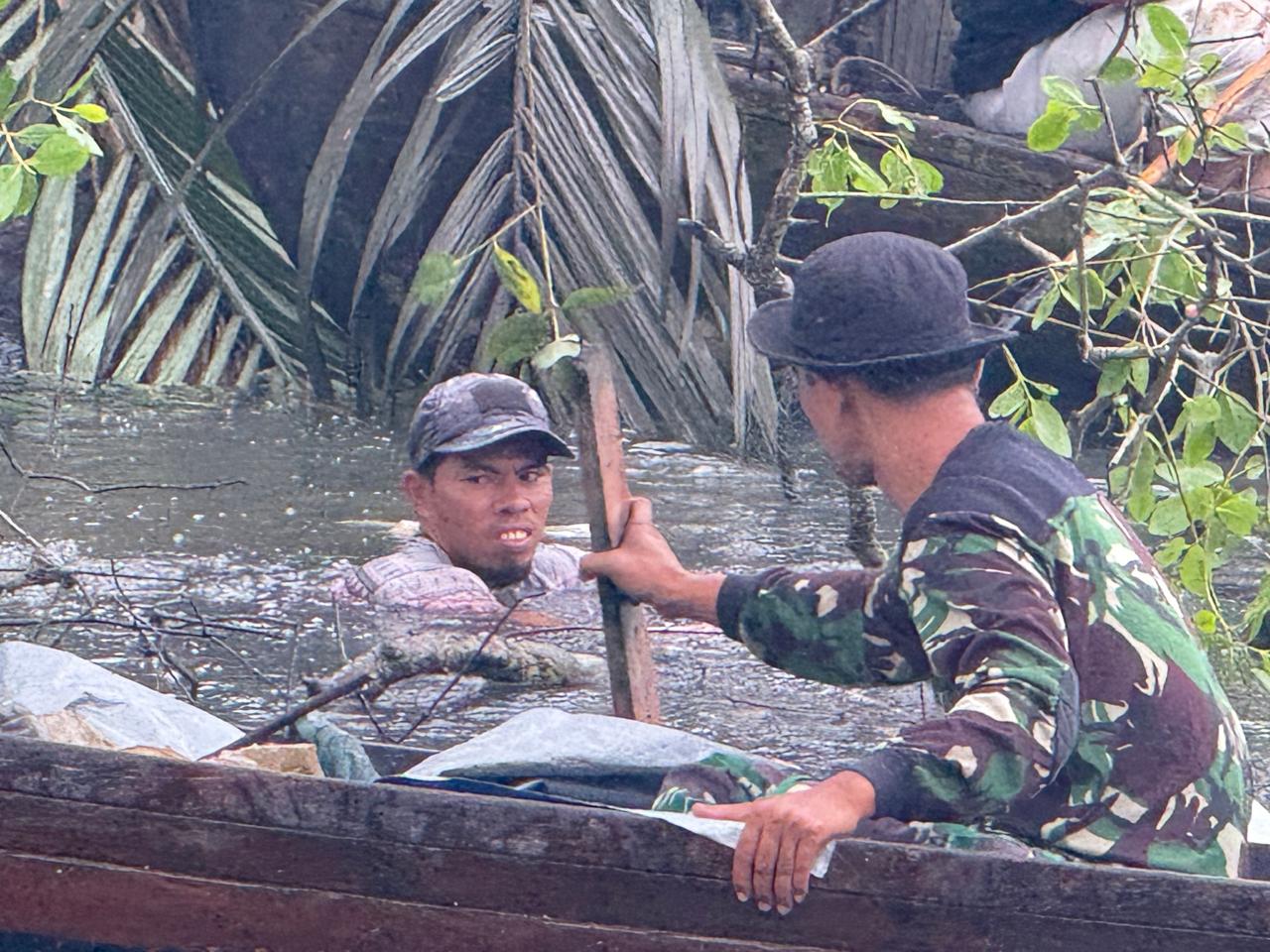 Terlihat jelas anggota TNI berseragam (loreng hijau) dan warga sipil (pakaian biasa) menggunakan perahu kayu untuk menjangkau titik-titik sumbatan. Hal ini adalah inti dari program TNI Manunggal Membangun Desa (TMMD), yaitu bergotong royong.