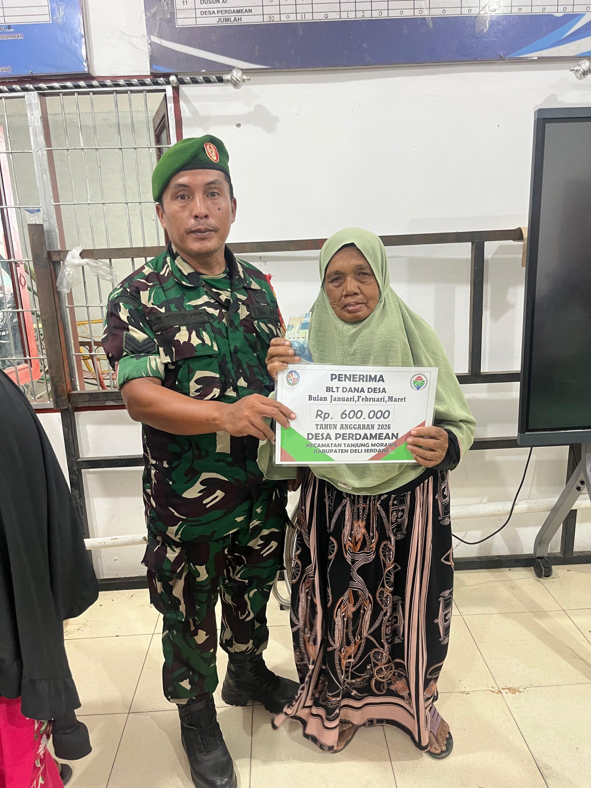 Wantaranews.com – Tanjung Morawa – Babinsa Koramil 0201-16/TM, Serka S. Tumanggor, melaksanakan kegiatan monitoring penyaluran Bantuan Langsung Tunai (BLT) kepada masyarakat Desa Pardamean, Kecamatan Tanjung Morawa, Kabupaten Deli Serdang. Kegiatan tersebut berlangsung di Aula Desa Pardamean dengan tertib dan lancar.