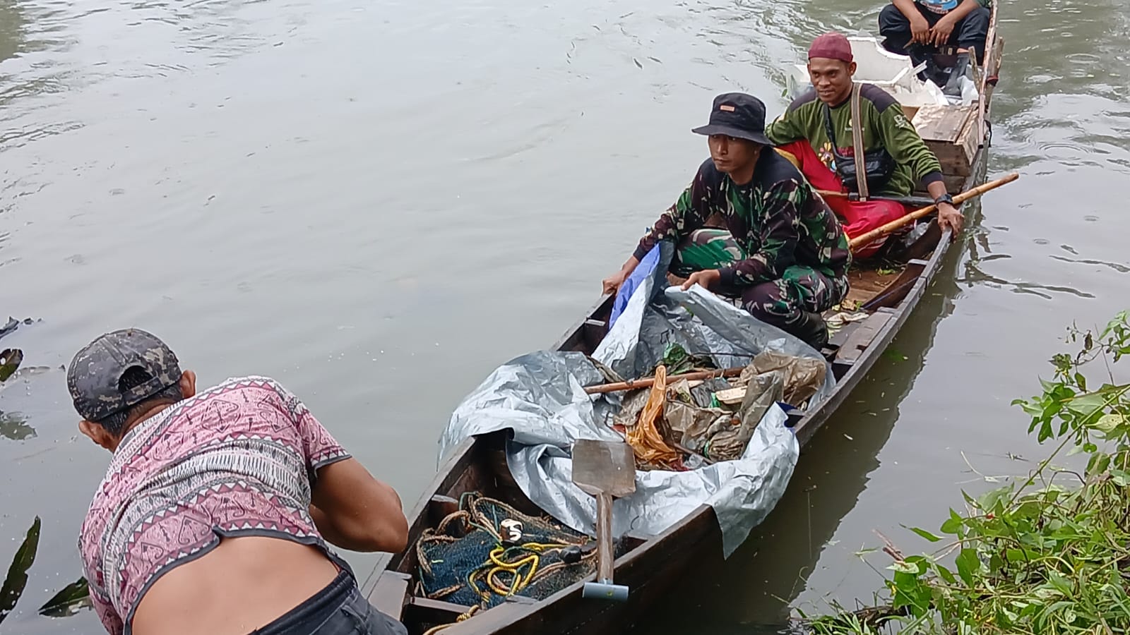 Sinergi disektor lingkungan, menampilkan perahu di sungai yang sarat dengan sampah dan material yang telah dikumpulkan. Di dalam perahu, terlihat seorang personel TNI yang mengenakan seragam loreng dan topi, bekerja bersama dengan seorang warga yang mengenakan kopiah dan pakaian sipil. Seorang pria lain di tepi sungai tampak membantu memindahkan atau mendorong perahu.