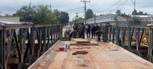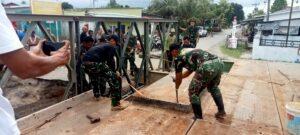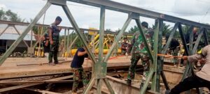 Pemasangan lantai jembatan yang dikerjakann Personel TNI (Zeni) terlihat sedang memasang pelat baja sebagai lantai jembatan untuk memastikan keamanan kendaraan yang akan melintas.