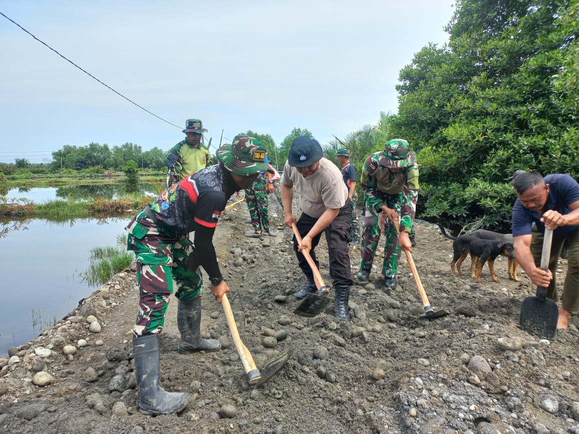 Kegiatan seperti ini sangat khas dalam TMMD, yang fokus pada pembangunan infrastruktur dasar di pedesaan. Berdasarkan lokasi yang tampak berlumpur, berbatuan, dan dekat dengan air serta tanaman hijau, kemungkinan ini adalah bagian dari: