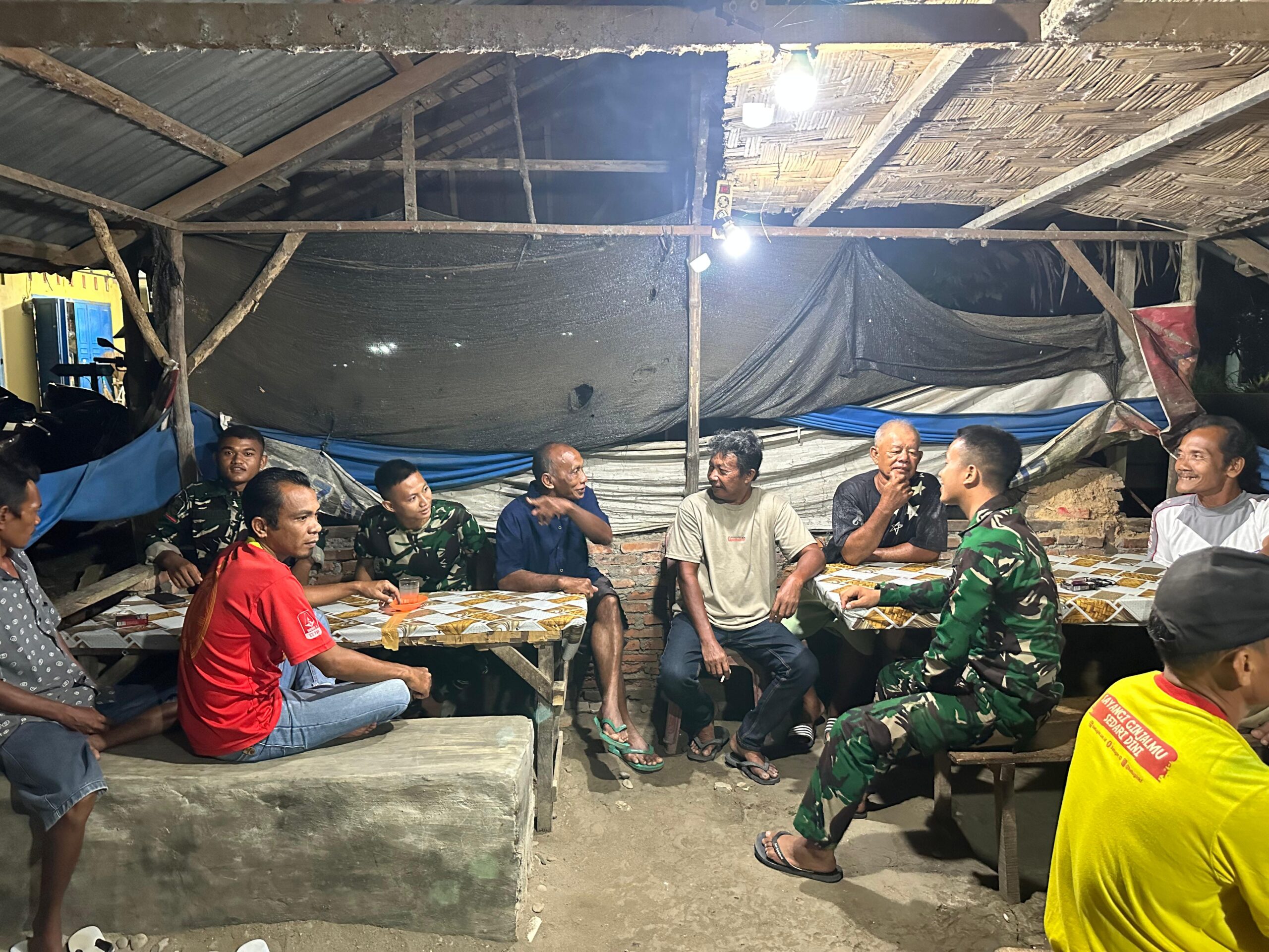 Hari ini Senin 27 April 2026,malam sekira pukul 20.00 WIB,usai melaksanakan Sholat Maghgrib dan Isya,4 orang prajurit Batalyon Teritorial Pembangunan (YON TP)907/Dewa Shahdan ngumpul bareng sembari ngopi bersama warga di Warung Ibu Ernawati (49).