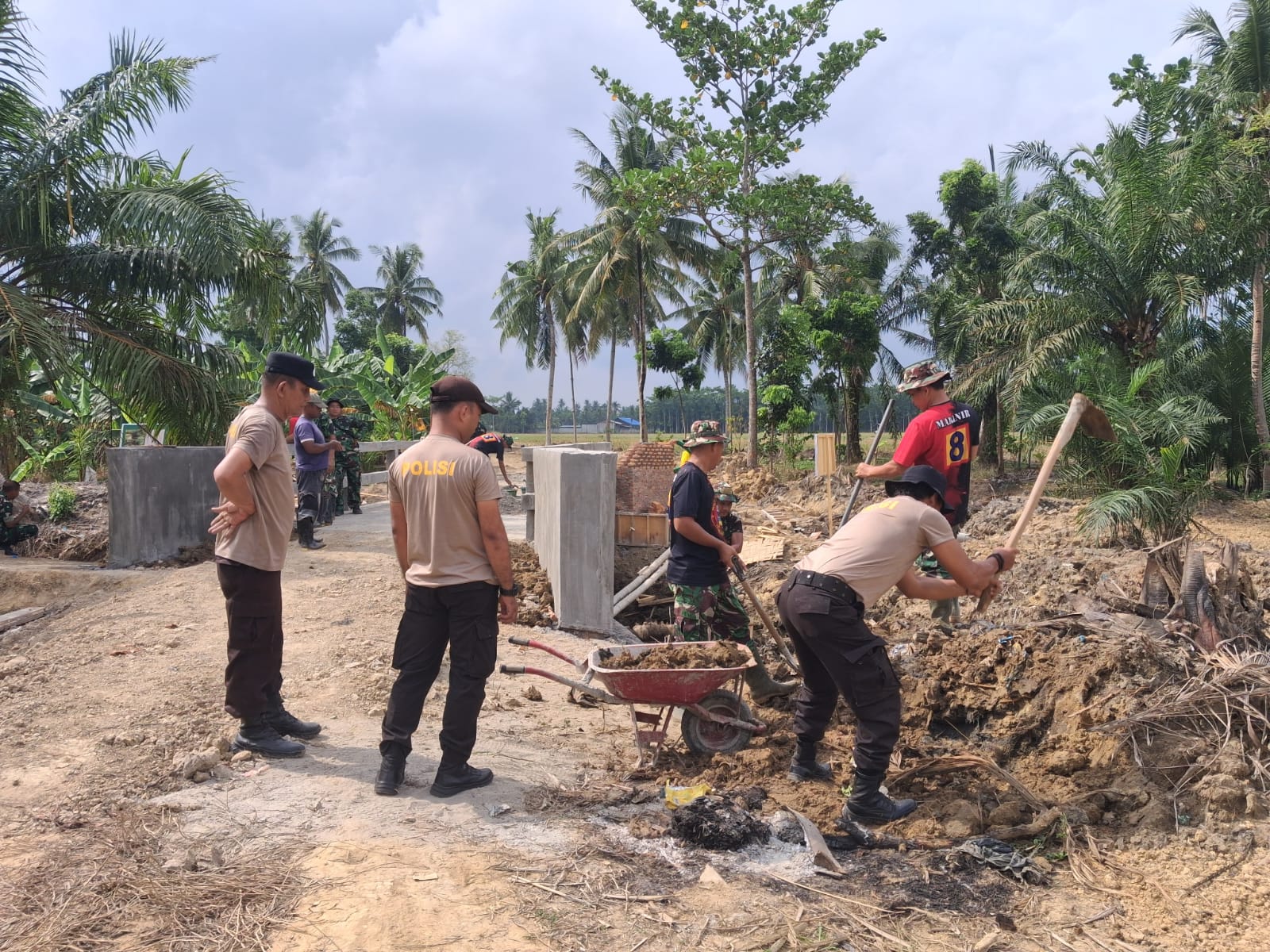 Peluh Bercucuran Dibawah Panasnya Terik Matahari, TNI Polri dan Warga Genjot Pembangunan Jembatan TMMD 128 Pasar Rawa