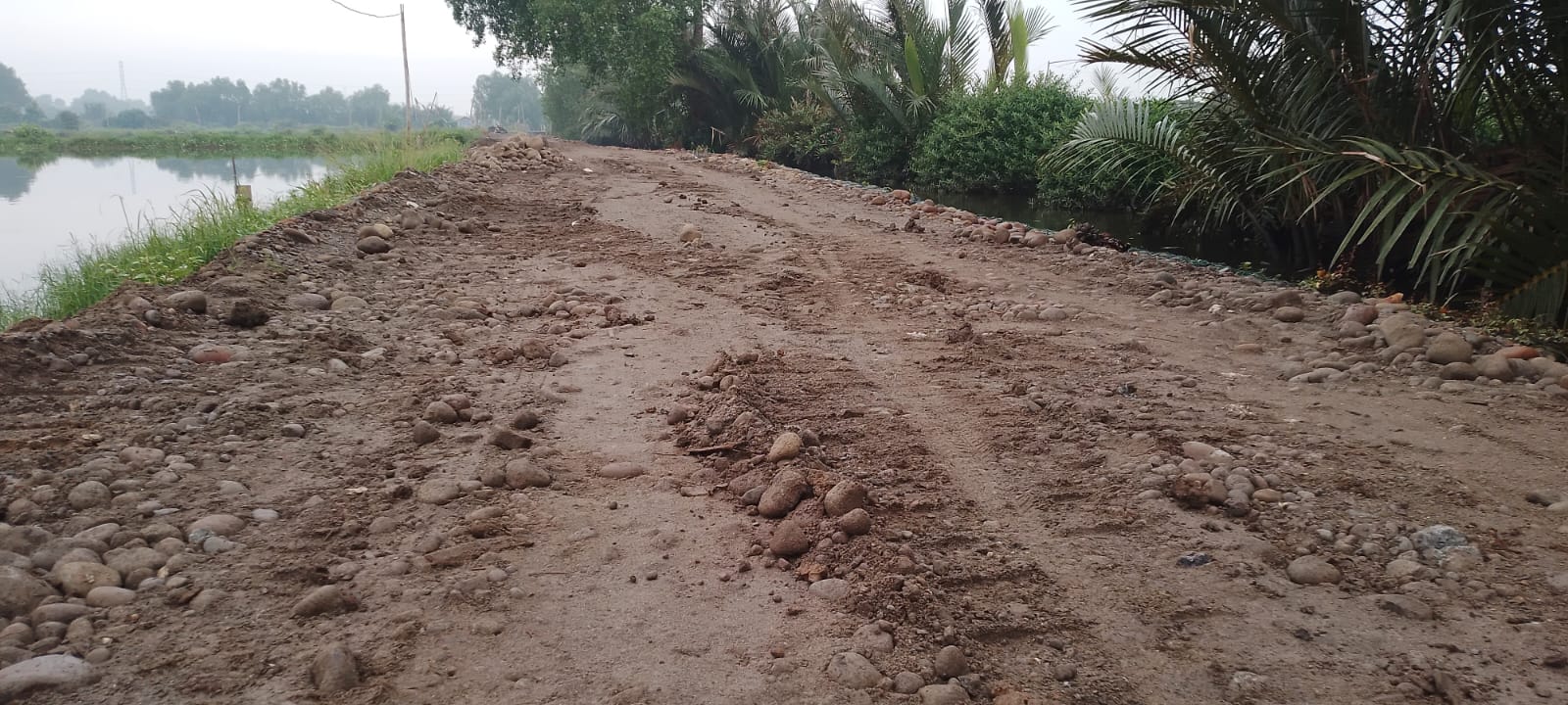 Wantaranews.com – Medan – Terlihat jelas sebuah jalan tanggul/pematang yang memanjang, diapit oleh area tambak/air di sisi kiri dan vegetasi lebat (nipah/sawit) di sisi kanan. Permukaan jalan ditutupi dengan lapisan tanah yang bercampur dengan batu-batu kerikil dan batu alam berukuran besar.