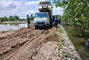 Dilapangan terlihat ada lapisan bronjong yang sudah terpasang dan mulai menyatu dengan tanah di bagian kanan (dekat air), sementara di sebelahnya sedang dilakukan penimbunan batu besar dan pemasangan kawat bronjong baru.