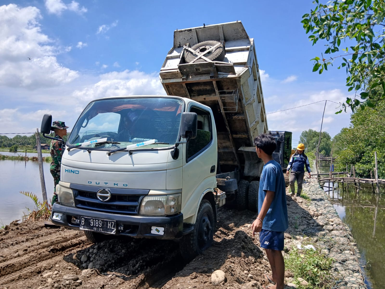 Sebuah dump truk Hino sedang menurunkan material timbunan, yang sebagian besar berupa tanah bercampur batu dan kerikil. Material ini digunakan untuk memperkuat pondasi jalan sebelum proses pengecoran beton (rigid beton).