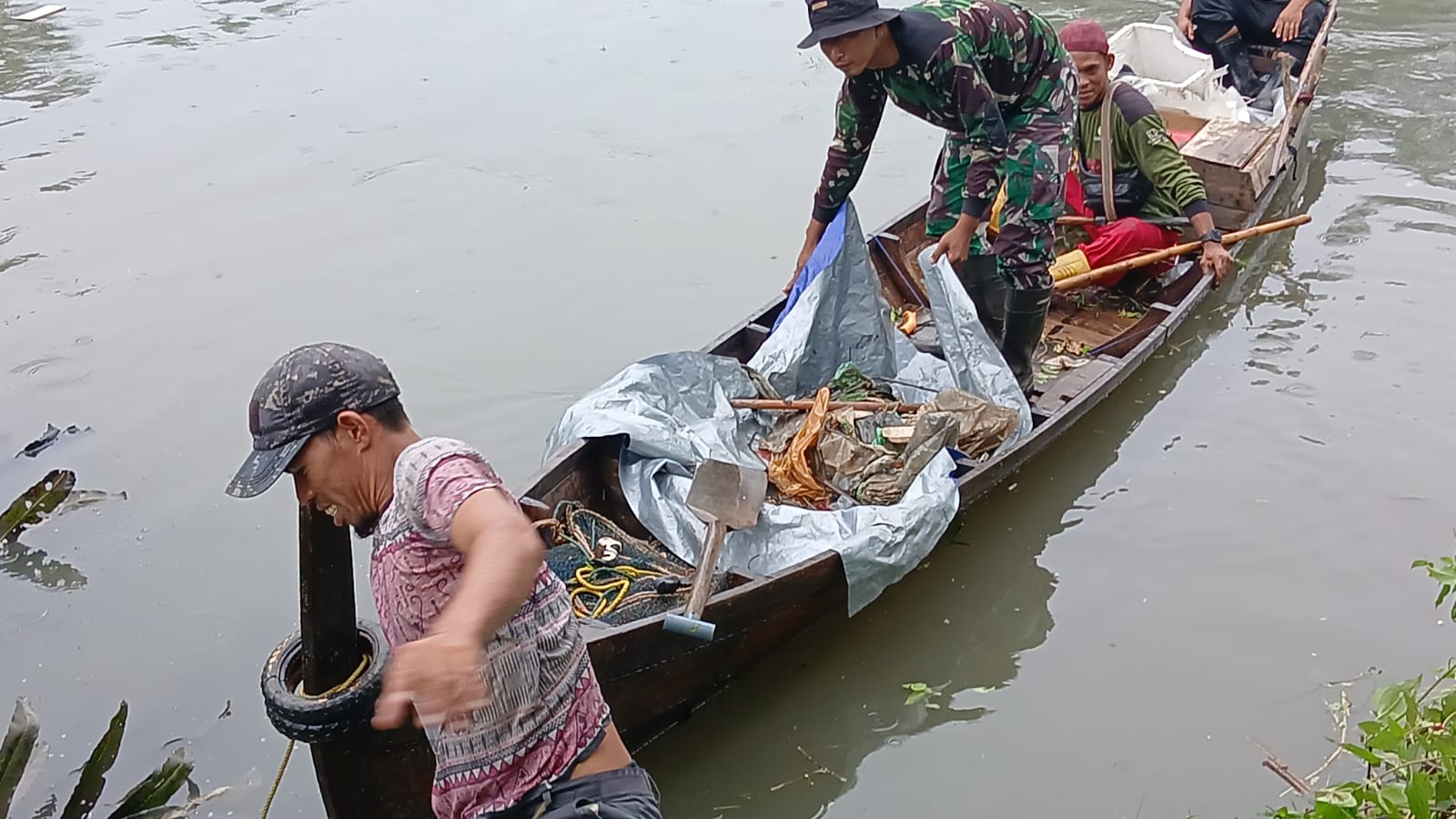 Prajurit TNI dan warga bekerja menggunakan perahu kayu tradisional kecil dan alat seadanya (galah, parang, dayung, karung) untuk membersihkan ranting dan sampah yang menghalangi aliran air.