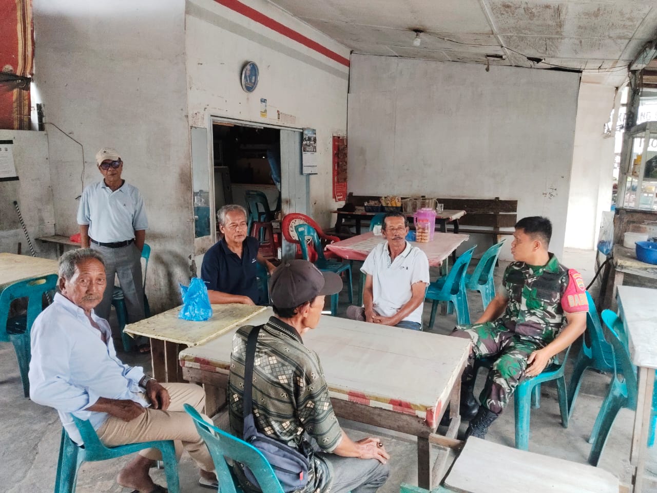 Dalam kesempatan ini Babinsa menyapa warga yang sedang duduk santai sambil minum kopi. Dalam percakapan tersebut, Babinsa mengingatkan pentingnya menjaga keamanan wilayah dan meminta warga untuk membantu dalam tugas-tugas pemantauan. Jika ada permasalahan, segera laporkan kepada Babinsa agar dapat diatasi bersama, ucap Babinsa kepada warga.