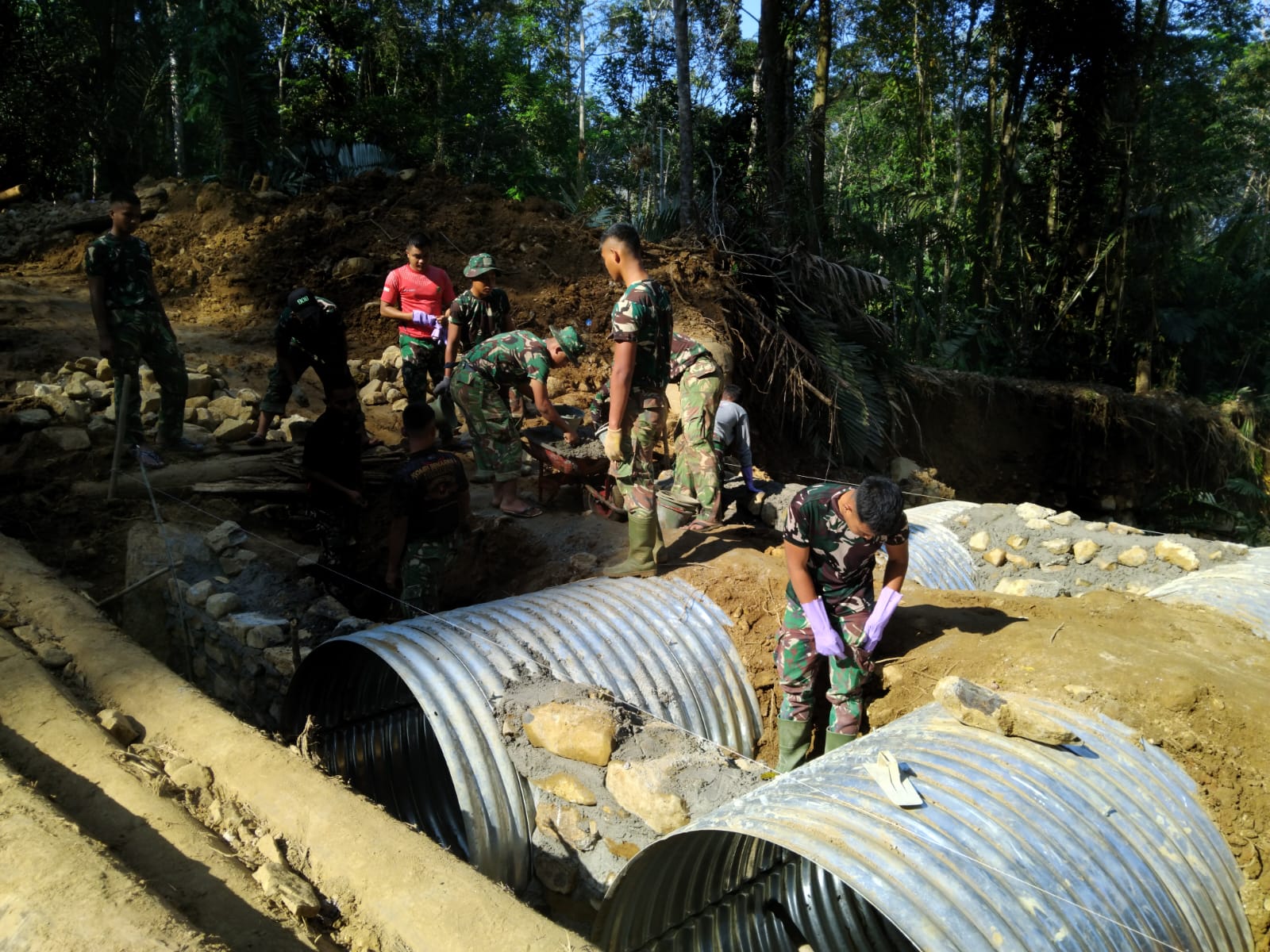 Kegiatan pembangunan melibatkan personel Koramil 04/Pinangsori, Denzibang 4/1 Sibolga, serta Yon TP 908/Gaja Dompak yang bekerja bersama di lapangan untuk memastikan pekerjaan berjalan aman dan sesuai rencana.