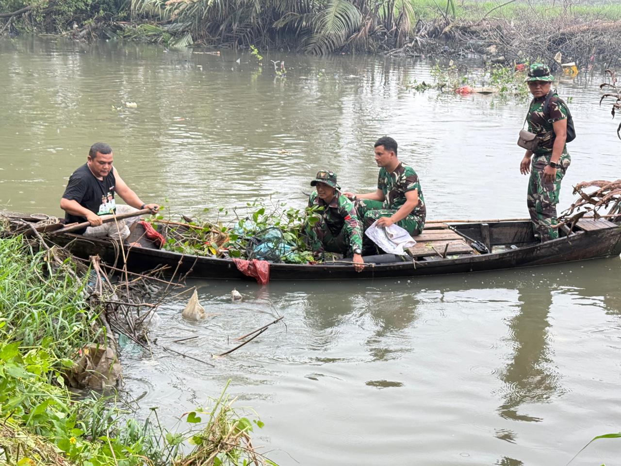 Para anggota TNI di dalam perahu terlihat mengangkut tumpukan sampah (termasuk sampah organik dan plastik) yang berhasil dikumpulkan dari sungai dan pinggirannya. Kegiatan ini menyoroti peran aktif TNI dalam program-program kemanusiaan dan pelestarian lingkungan.